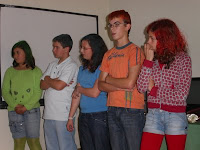 Uma narradora contou a história da lenda de Oníris e um pequeno grupo de alunos (com o cabelo pintado de cada uma das 7 cores) apresentou cada uma das minhas personagens e a sua respectiva raça, identificando no mapa o respectivo território.