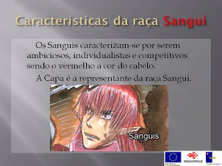 está muito giro, mas sinceramente, quem representa a raça Sangui é o Erik, a minha personagem favorita! Ele mostra-nos que podemos sempre mudar e que não devemos rotular as pessoas... Fiquei tão feliz quando ele e Seara ficaram juntos, acho que eles combinam, completam-se... Estive também a fazer o teste e sabe uma coisa gira que me aconteceu? tive resultados iguais!! os mesmos pontos para sangui e para verdi, duas raças tão diferentes!!! Fiquei muito contente por ser as personagens que mais gosto!!! Estou ansiosa pela banda desenhada (que se calhar até já saiu e eu não reparei, mesmo meu género de coisa -.-')e acredito que vai haver um filme feio a partir do seu livro, e que será um grande sucesso de bilheteira, como podia não ser?? peço desculpa por este "testamento" ma só descobri o seu blog agora, e não me contive (outra coisa que é tipicamente minha...) para além disso, eu acho que sofro de um "problema crónico": na maior parte dos livros que leio as personagens que me atraem mais são sempre os "maus da fita", não sei porquê, mas acho que é porque eles são sempre incompreendidos, e, quando lhes dão a oportunidade de mudar e es mostram quem realmente são, são sempre pessoas muito melhores do que inicialmente pensámos (como Erik... eu tenho mesmo ma fixação por ele :D)